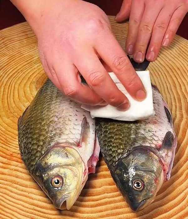 清洗幹凈的鯽魚用廚房紙把表面的水分擦幹,不然煎的時候容易炸油。