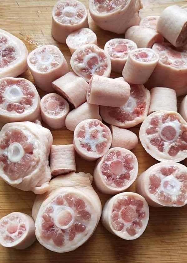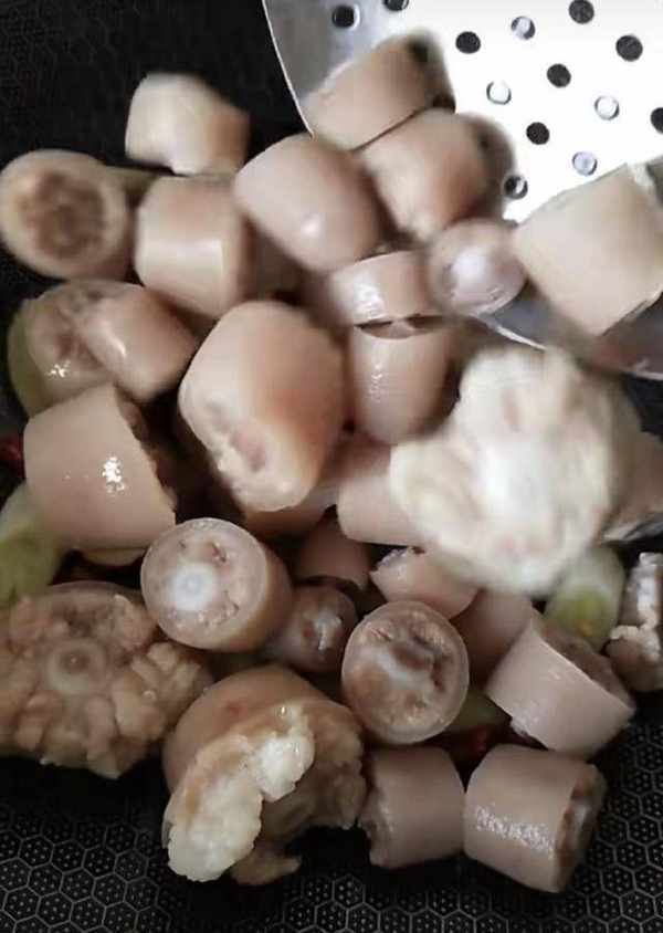 準備四根豬尾,剁成小塊,涼水下鍋,加料酒,大火煮出浮沫,撈出沖洗幹凈。