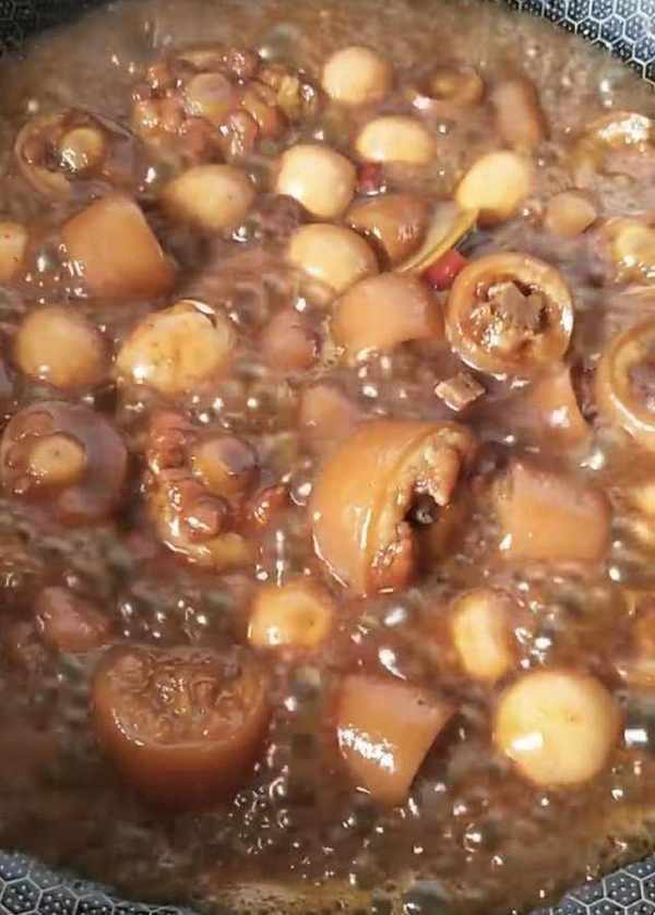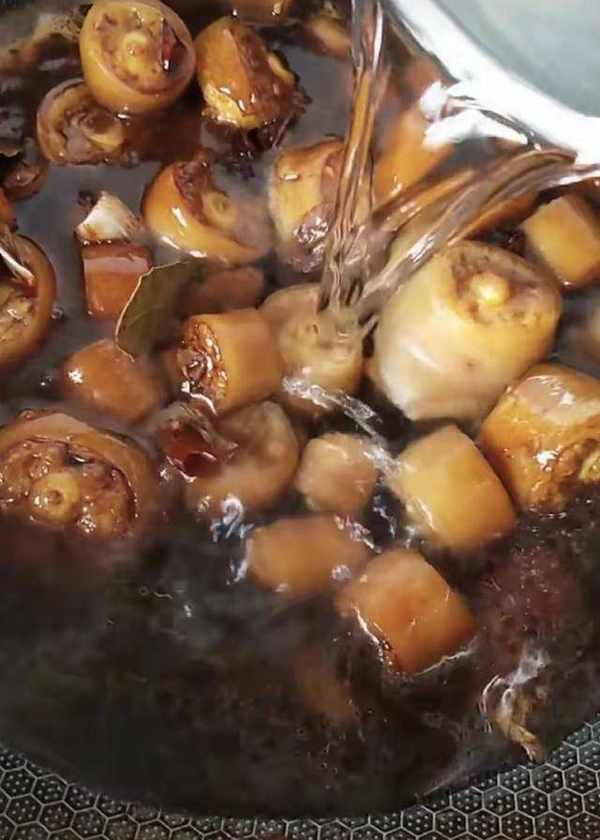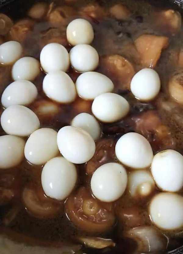 加水,放入鵪鶉蛋,放鹽、雞精、十三香調味,開鍋以後蓋上鍋蓋,小火燜40分鐘。