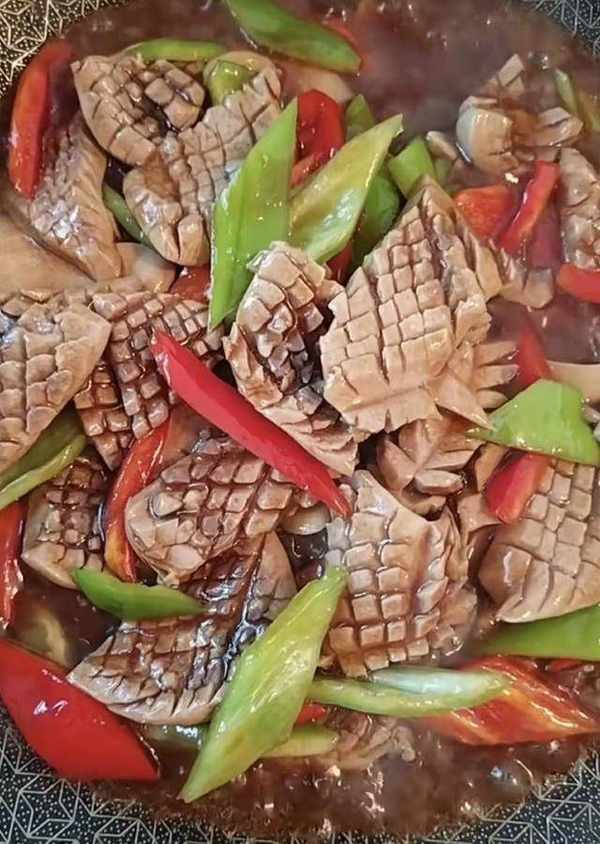 起鍋燒油,放蔥、薑等大料爆香,加一勺醬油,蠔油、加一大勺水,加鹽、雞精、白糖調味,放水淀粉勾芡,放入腰花、辣椒,翻炒出鍋。