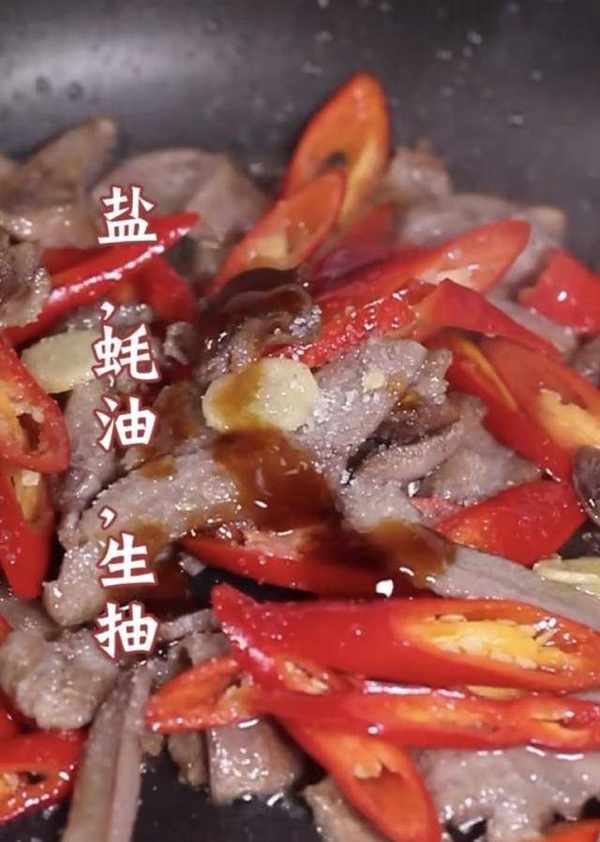 鍋燒油,下薑片、豬舌,炒出香味,放紅辣椒,翻炒均勻。