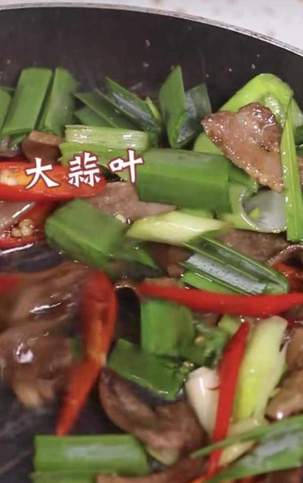 加鹽、蠔油、生抽調味,最後再放一點大蒜葉,翻炒均勻,小炒舌尖做好瞭。