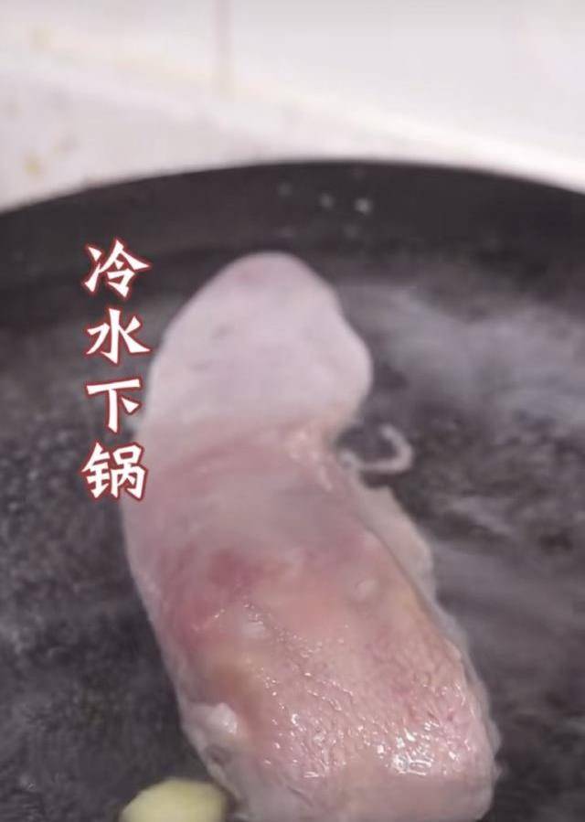 取一條豬舌,冷水下鍋,放薑片、料酒煮3分鐘,然後撈出,掛掉豬舌上白色膜狀。