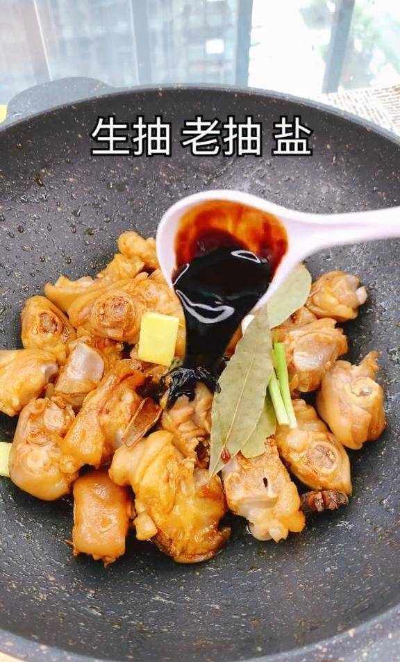 2.鍋中熱油,放入冰糖炒出棗紅色,放入豬蹄,翻炒均勻,加入蔥、薑、八角、桂皮、香葉、生抽、老抽、鹽、泡發的黃豆,翻炒均勻