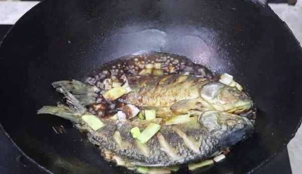 4、魚下入鍋內的時候先不要來動它,把魚煎好,煎定型,之後再來晃動一下鍋子,一面煎成黃色之後再來翻一個面,把另一面也煎成黃色,下入薑片和蔥段,繼續煎,去除腥味,從鍋邊淋入一點料酒去腥。加入一點老抽,蒸魚豉油,生抽醬油,再來一點陳醋去除腥味,再加入白糖提鮮,再接著加入清水,再加入少許的食鹽,大火燒開之後改成小火煮15分鐘。把魚燉入味,燉透,再開大火把湯汁收一下,收濃稠,就可以出鍋瞭,紅燒鯽魚就制作完成瞭,撒上少許蔥花,既好看又美味。