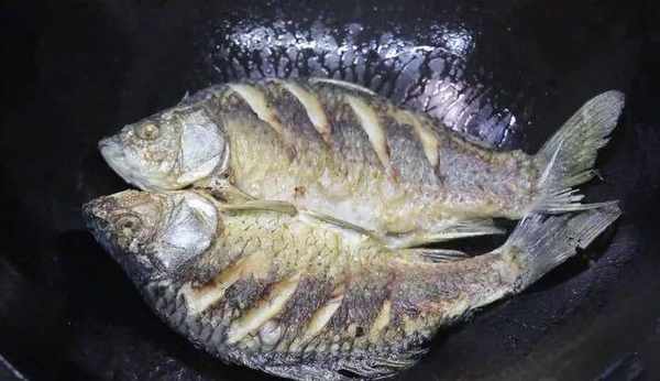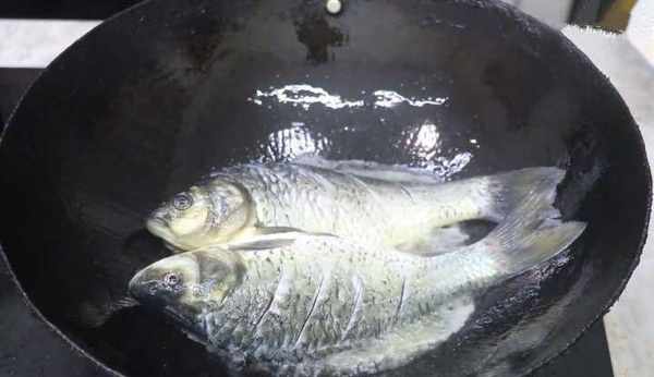 3、把鍋充分燒熱,轉動一下,鍋的四壁也燒熱,加入一勺食油,一定要讓熱油粘上鍋的四壁,這樣待會在煎魚的時候就不會粘鍋,不會破皮瞭。有很多朋友在煎魚的時候魚頭或者魚尾容易粘鍋破皮,就是鍋沒有燒熱。再把油倒出去,再重新加入一勺油,再下入處理好的鯽魚。