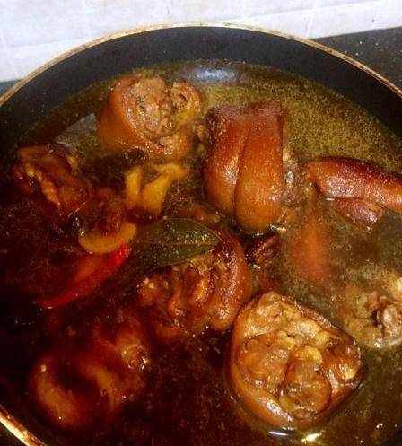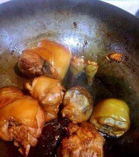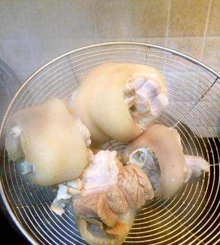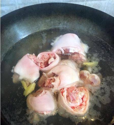 豬蹄斬小塊,拔幹凈毛,鍋內燒水煮沸,放豬蹄,水重新沸騰後關火,撈起豬蹄,用涼水沖去浮沫,控幹水分
