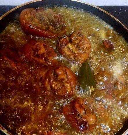 放控幹水分的豬蹄,轉大火,翻炒,直到皮成金黃色