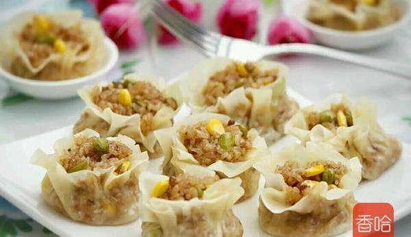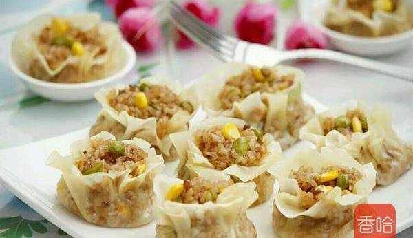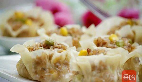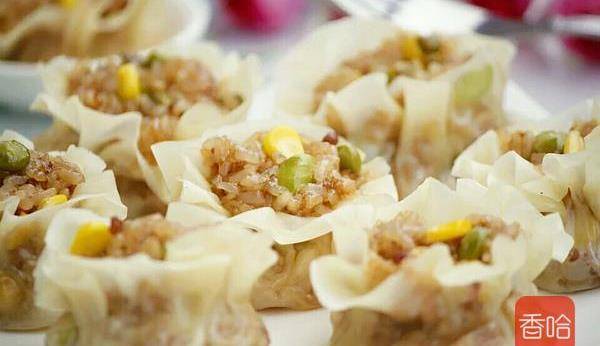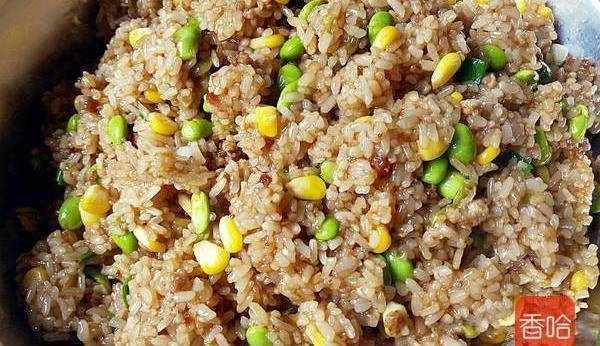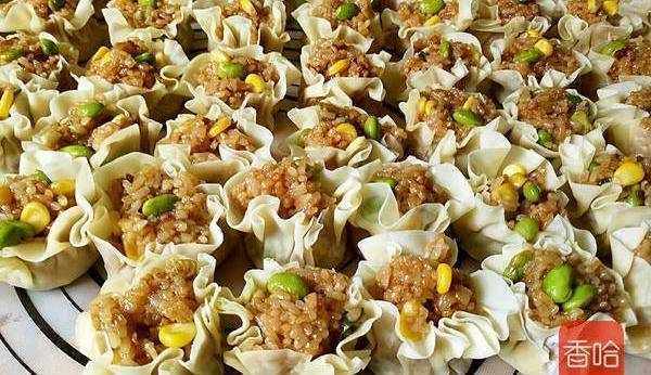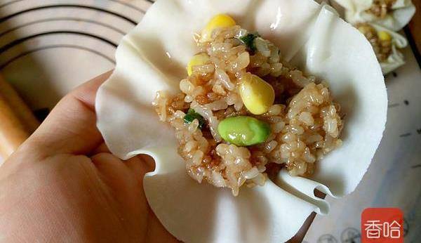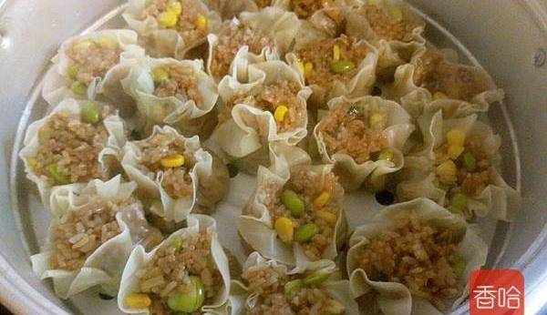 餃子皮適量、糯米適量、毛豆適量、玉米粒適量、香菇隨意、肉碎適量、香蔥2根、料酒少許、老抽少許、白糖少許、食鹽適量、雞精少許、食用油適量