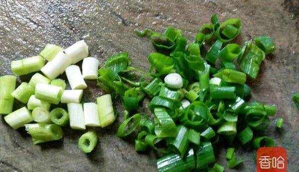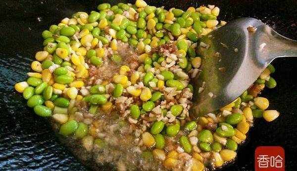 7.加入玉米粒,毛豆和蔥白翻炒片刻。