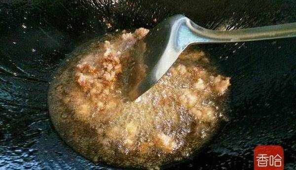 6.鍋中倒油燒熱,加入肉碎炒金黃。