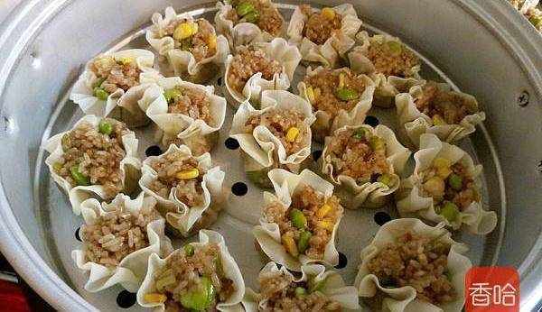 17.蒸格上抹點油防粘,放入包好的燒賣。
