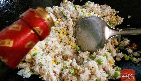 8.倒入煮好的糯米翻炒片刻,加入少許料酒,老抽,白糖,清水適量鹽翻炒片刻,撒蔥花雞精拌勻即可。