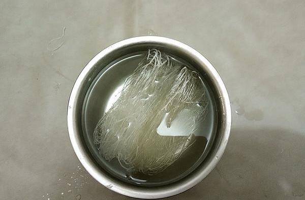 2、將所有的食材全部準備好之後,我們就可以將粉絲先放在盆裡面,然後倒入溫水進行泡軟。
