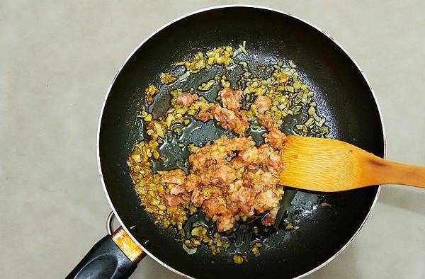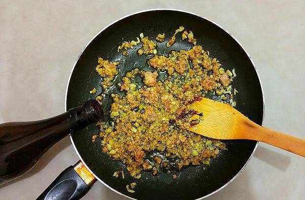 6、放入蔥薑和蒜末爆出香味之後,就可以放入準備好的肉末瞭,炒到肉末變色就可以再加入適量的醬油和料酒,少許的白糖,攪拌均勻。