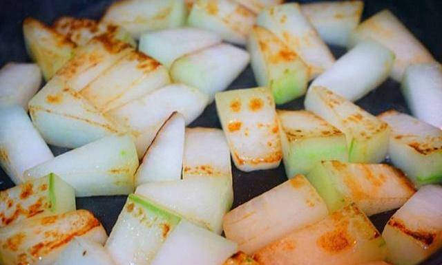 接著鍋中倒入水適量油加熱,油溫升高,下入冬瓜塊翻炒,煎至冬瓜塊每一面都成焦黃色。
