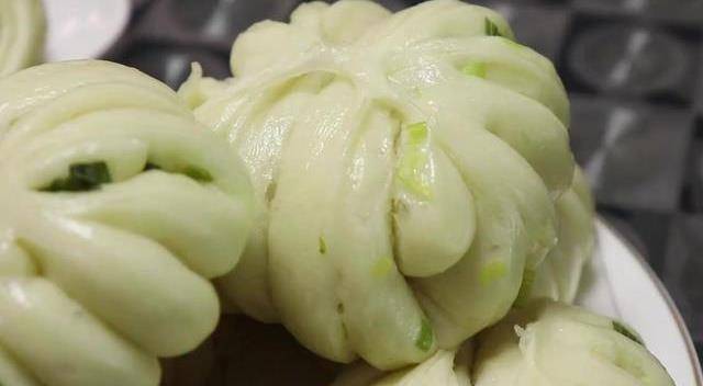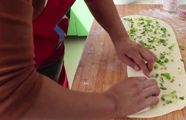 往裡加一小勺小蘇打,再加少量的溫水化開,倒入和面盆裡和面團揉在一起,我們看一下把面團揉光滑,面團揪成兩等份,然後再揉光滑,再用搟面杖搟的薄厚均勻些,上面刷一層油,撒少量的鹽,再撒上蔥花,從一端卷起來,切成這個是第1種手法,這個是第2種手法,核桃花卷稍微有一點點的復雜。