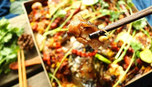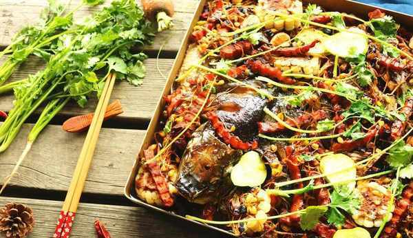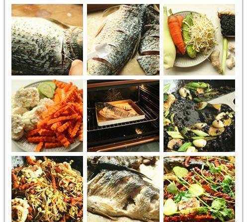 9、把炒好的蔬菜鋪到魚身上。再次送入烤箱烤15分鐘左右即可。烤好的魚,鋪上香菜,潑上燒熱的花生油,好吃的豆豉烤魚就可以開吃瞭。