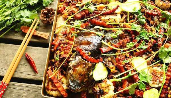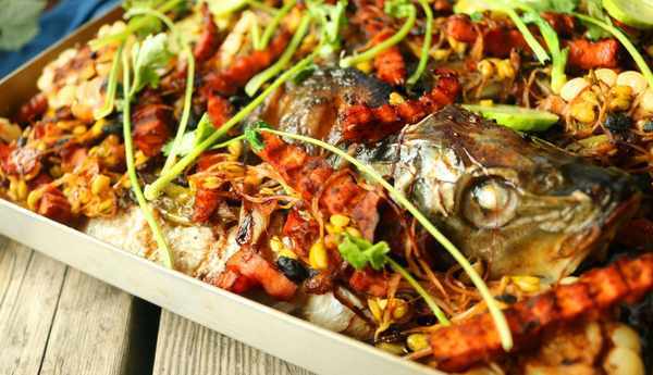 鯉魚一條 花生油30毫升 鮮玉米1個 胡蘿卜2個 黃瓜1根 豆芽200克 蔥1棵 香菜2棵 薑1塊 蒜1頭 豆豉30克