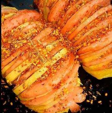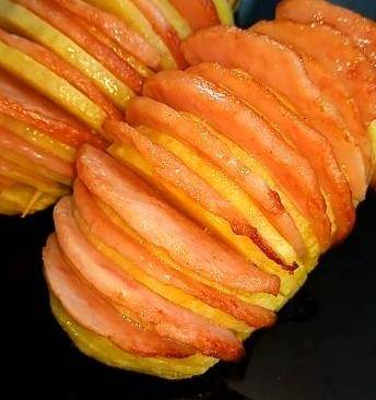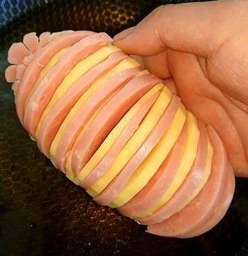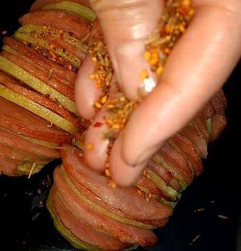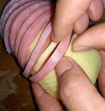 然後將切成片的午餐肉一片一片的塞進風琴土豆裡,就變成瞭胖胖的一隻非常的可愛。這個時候準備適量的食用油放在油鍋裡開始炸就可以瞭。