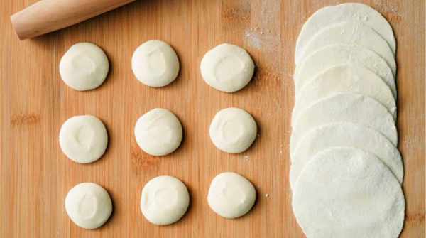 第四步:向肉餡裡加入芹菜、木耳、胡蘿卜和玉米粒30克,然後加適量的麻油混勻。接著將面取出搓粗條,再分成適當大小的面團並搟平即可開始包制。