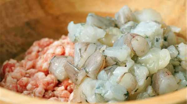 第三步:將芹菜碎放到碗內,加適量鹽混勻入味,然後將水分攥出去備用。碗內放入肉餡300克,然後加蔥薑水適量,將肉餡打上勁,在混入7克鹽混勻,接著把蝦段、糖12克和白胡椒3克、料酒1大勺加入混勻密封醃一會兒。