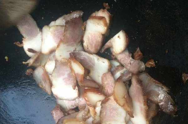 3、鍋內放入少許油,燒熱放入臘肉片翻炒至肉質透明撈出;