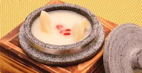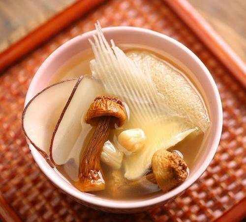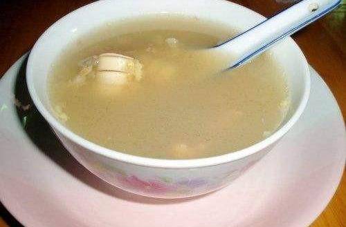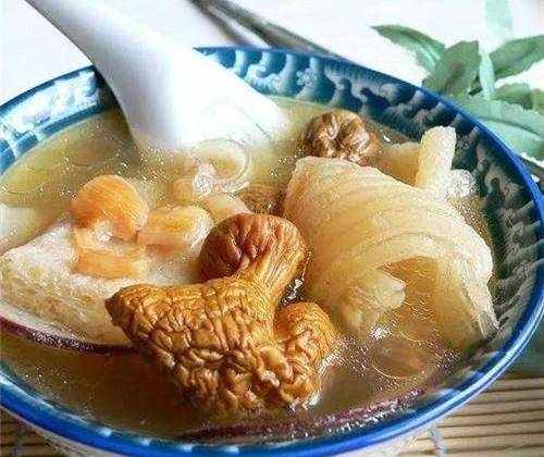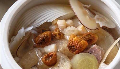 取猴頭菇30克,鯊魚骨80克,白果20克,瘦肉250克,淡菜15克,薑3片。猴頭菇泡軟、鯊魚骨泡發後,將所有食材洗凈,鯊魚骨和瘦肉分別氽水後撈起,再把所有材料放入煮沸的清水裡,大火煮沸改文火煲兩個小時,下鹽調味品嘗,滋陰益氣養胃。