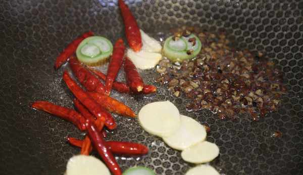 4、 炒鍋中倒油,油熱後放入蔥段、蒜片炒出香味後,放入花椒和洗凈的幹紅辣椒再次熗炒出椒香味。