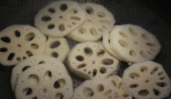 3、 鍋中燒水,水開後放入藕片焯半分鐘,焯好後再次撈到清水中浸泡。