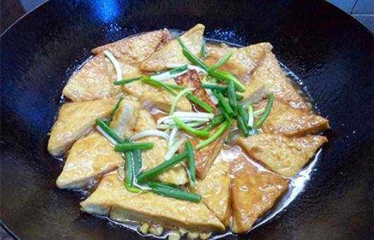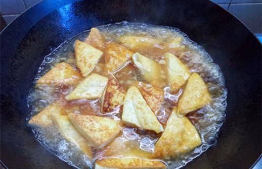 等到豆腐塊的兩面完全見到金黃,已經出現瞭虎皮花紋的時候,就可以把豆腐塊盛出來瞭。
