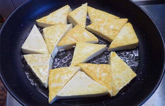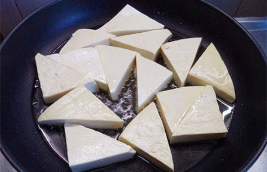 首先我們將新鮮的白豆腐清洗幹凈,然後在6點之前把它切成三角形的豆腐塊,這樣吃起來更容易入味而且顯得更加漂亮,接著我們起鍋燒油,在平底鍋當中加入稍微多一點的食用油,然後把已經幹凈的豆腐放入鍋中用中小火去慢慢的一直煎到自己的表面金黃。