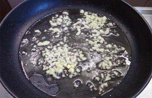 借著鍋中留少許的底油,把準備好的蒜末放入鍋中去倒出香味兒。