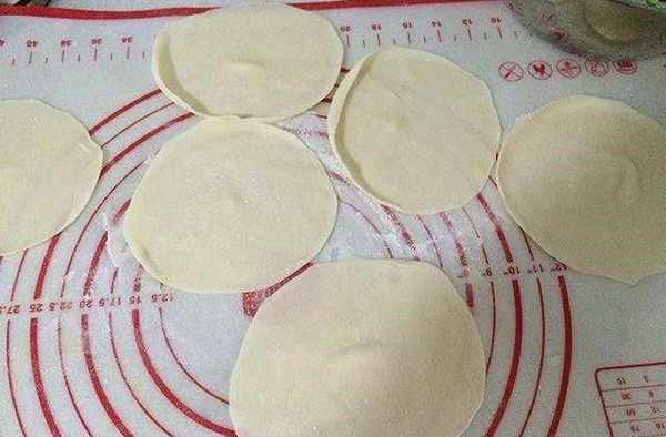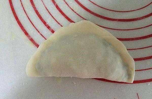 8、面片搟好後,把調好的餡放入面片上,包的時候別忘記餡裡面要加鹽,包成自己喜歡的形狀。