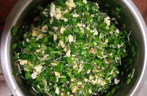 6、再把切碎的粉條,也放入韭菜盆中,把雞蛋放涼後也放入容器中攪拌,加入熟油,胡椒粉先用筷子攪拌均勻。鹽要等到準備包韭菜盒子的時候再放。不然會把韭菜的水分都醃出來瞭。