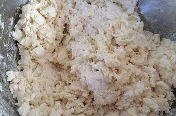 2、面粉倒入容器中,邊倒開水邊用筷子攪拌,攪拌成棉絮狀。(用開水燙過的面,做好的面餅吃著特別的柔軟)