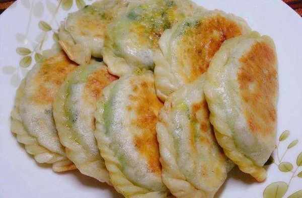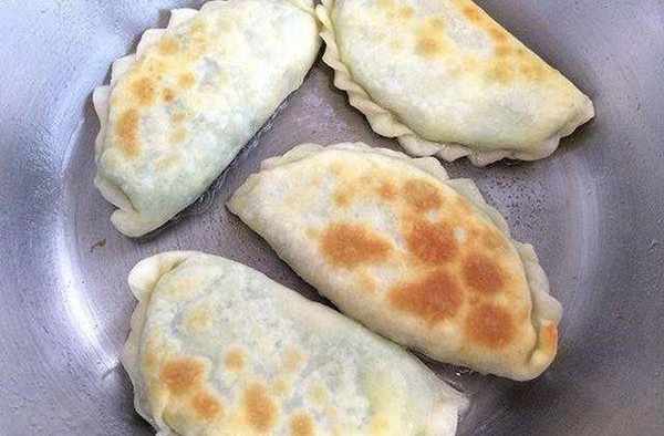 9、平底鍋內放少許的菜籽油,將包好的韭菜盒子上,小火慢煎,煎至兩面金黃