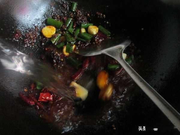 第二步:鍋裏放入花生油,入葱薑,大蒜,麻辣底料炒香。