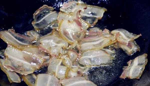 2、鍋裡再放入少量的食用油,再放幾粒花椒,把臘肉片倒入鍋中炒出油脂和香味。