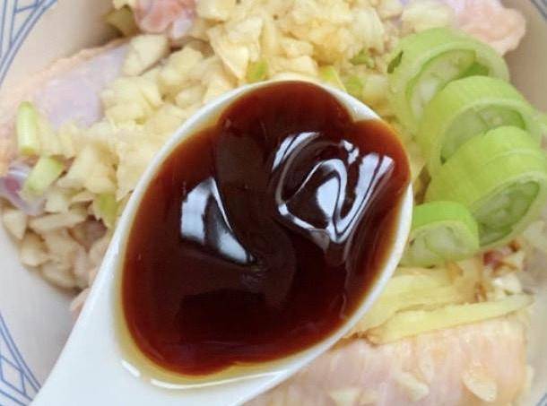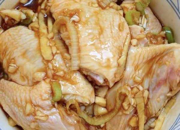 第四步:拿一個大碗,放入備好的雞翅,加入適量蔥段,薑片,多放點大蒜末,兩勺料酒,一勺蠔油,一勺蜂蜜,兩勺生抽,一勺食用鹽,抓拌均勻醃制15分鐘