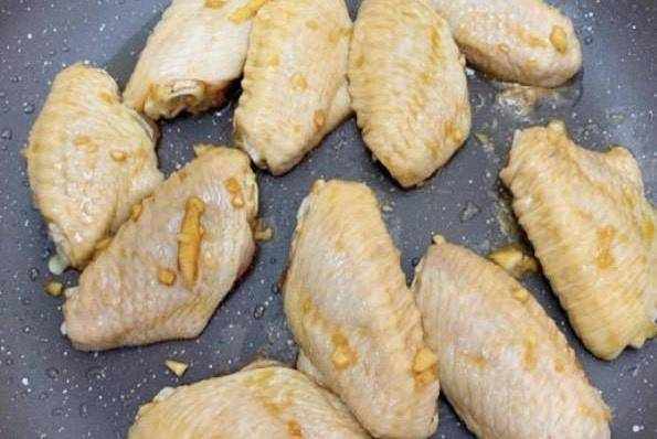 第五步:雞翅醃制好以後,起鍋燒油,油稍微多一點,油熱放入雞翅,小火慢煎,大概煎18分鐘左右,兩面煎至金黃色,18分鐘左右就熟得差不多瞭