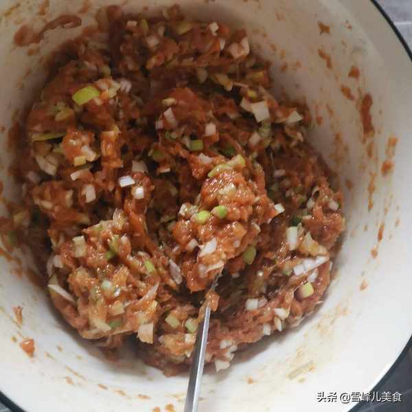 第四步:把切好的大葱放入肉餡中攪拌均勻即可。
