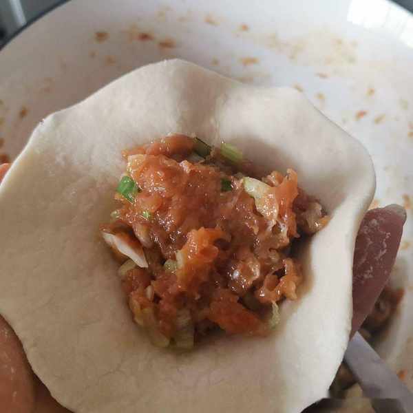 第六步:包子皮中放入適量的餡料。肉餡包子不建議放太多的餡料,適當即可,肉餡太多吃起來會膩。