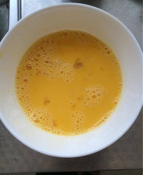 步驟四:打開小火,往鍋裡倒入適量的油,然後把將攪拌均勻的雞蛋液順著鍋邊慢慢的倒下去,在煎的時候我們一定要註意這個火候,火太大瞭容易燒掉,味道也變得不好。