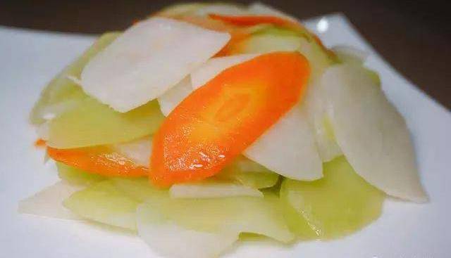 土瓜剝皮切成薄片,萵筍和胡蘿卜削皮切成薄片,鍋裡倒油爆炒,加鹽調味出鍋。