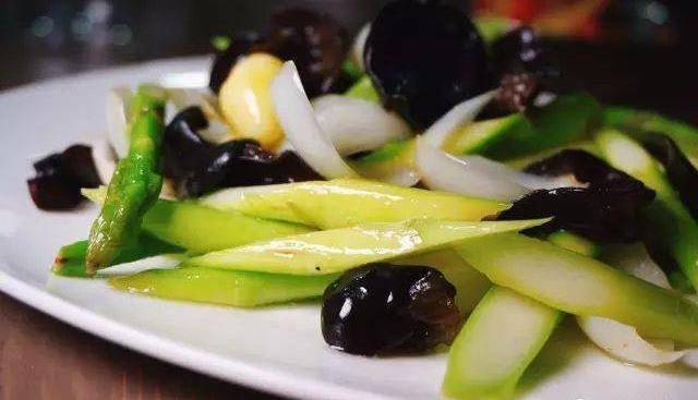 3.鍋裡倒油,先煸炒蘆筍,再把鮮百合、黑木耳和熟白果倒入煸炒,撒鹽調味出鍋。