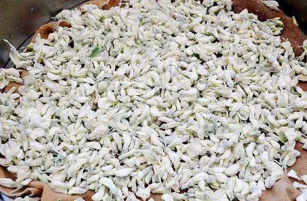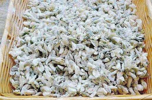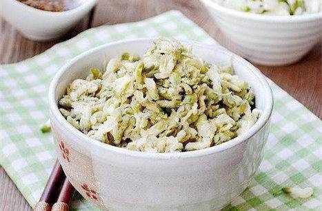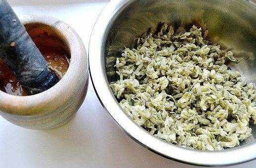 5.趁熱把槐花晾開。蒜加辣椒油和鹽,放入蒜臼搗成泥,加入少許清水、香油和雞精制成料汁,澆在槐花裡拌勻。