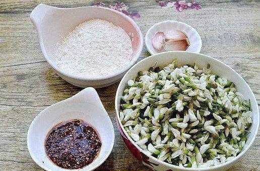 所需食材:槐花1大碗、面粉1小碗、鹽2勺、蒜瓣3個、辣椒油1勺、雞精1茶匙、香油1茶匙