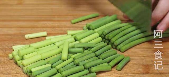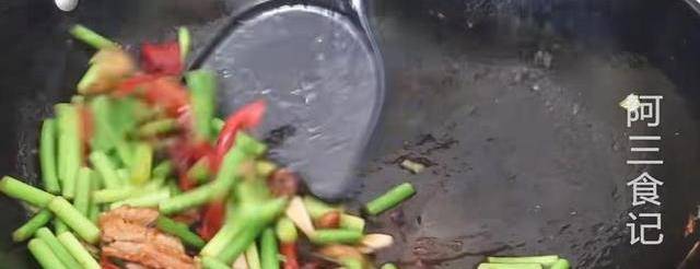 起鍋燒油,放入切好的肉片,翻炒至變色,加入蒜片和蔥花,繼續翻炒,炒出香味。緊接著加入蒜薹大火翻炒一分鐘,放點食鹽,生抽,蠔油和老抽調味,在翻炒勻色後加入紅椒翻炒一分鐘。