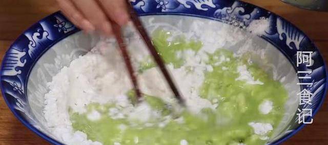 3.在碗中放入50克面粉,加入30克淀粉,用筷子充分攪勻,在沒有結塊後倒入黃瓜皮汁,攪成糊狀,要一直攪拌至看不到幹面粉,呈綠色的糊狀,放在一邊待用。